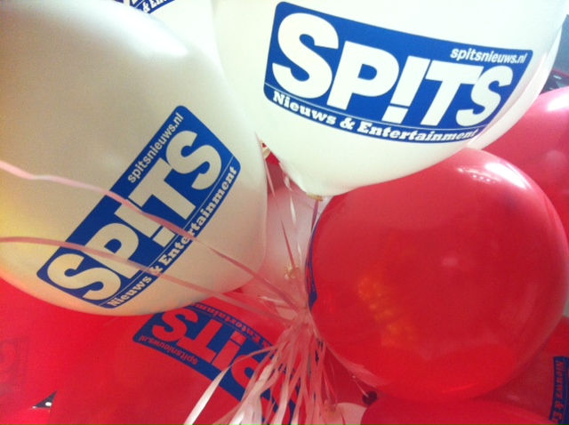 Bedrukte ballonnen met heliumgevuld, geleverd voor de Spits krant.