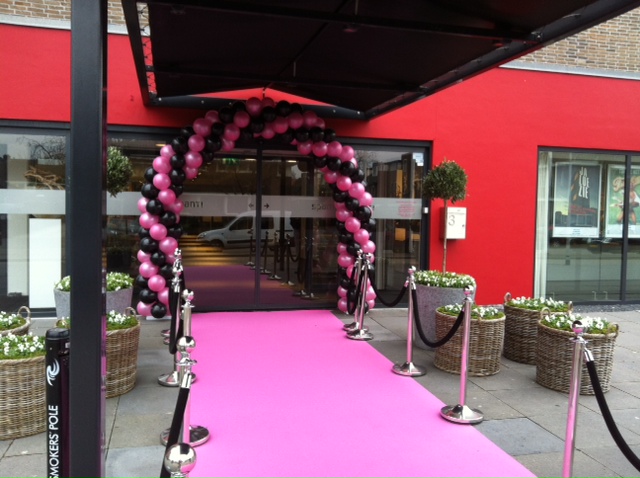 Ballonnenboog met rode loper en afzetpaaltjes geleverd voor de opening van een nieuwe viswinkel in Dieren