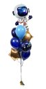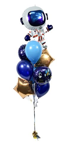 Ballonboeket happy birthday Space bestaat uit een grote heliumgevulde folieballon in de vorm van een astronaut met daar onder 4 latex heliumballonnen in blauwtinten, 2 folieballonnen met space birthdayprint en 2 gouden folieballonnen in stervorm.